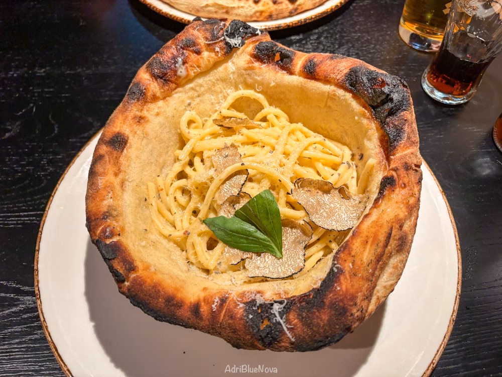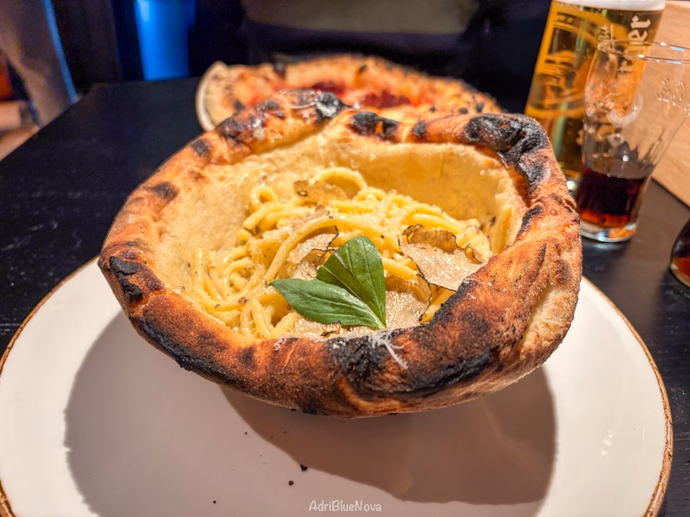 - TRUFFLEPASTA IN A PIZZA BOWL (22 €): Eine weiße Trüffelcream mit Bucatini, Parmigiano Reggiano 24 Monate DOP und schwarzem Trüffel, serviert in einer essbaren Pizzaschale. Die Pasta war cremig, aromatisch und überzeugte auf voller Linie.