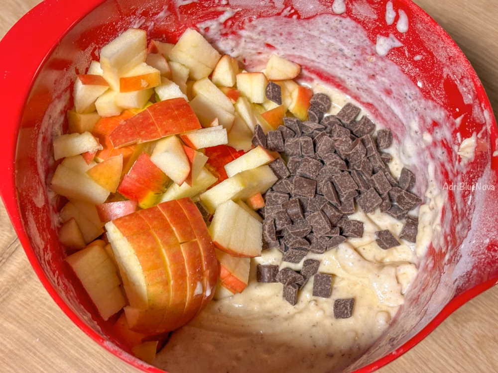 - Teig: Butter, Puderzucker, Eier und Vanillezucker schaumig schlagen. Mehl, Mandeln, Backpulver und Zimt vermischen und abwechselnd mit der Buttermilch unter die Masse rühren. Zum Schluss die Apfelstücke und Schokodrops unterheben.