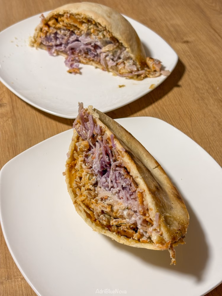 Das Ergebnis war ein perfekt aufgebackenes, außen knuspriges Fladenbrot. Das Hähnchenfleisch, die Sauce, das Kraut und die Tomaten – alle Zutaten sind bereits sorgfältig im Inneren arrangiert.